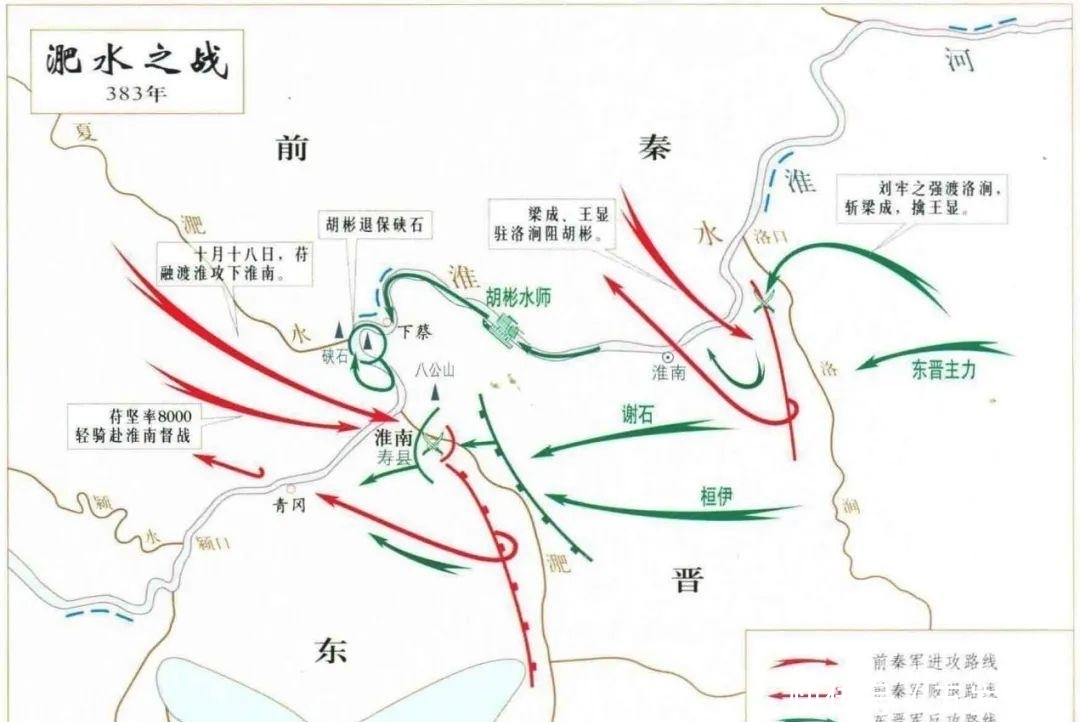 公元383年,北方的统一政权前秦向南方东晋发起了一系列侵略吞并的战役,其中前秦出兵伐晋,于淝水交战,拥有绝对优势的前秦败给了东晋,国家开始衰败灭亡,而东晋仅以八万军力大胜八十余万前秦军。