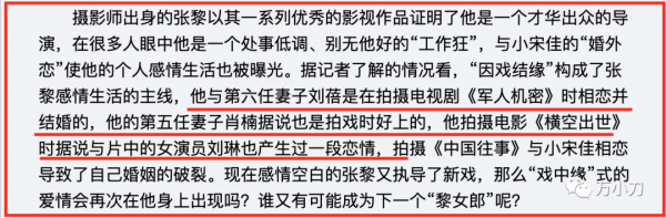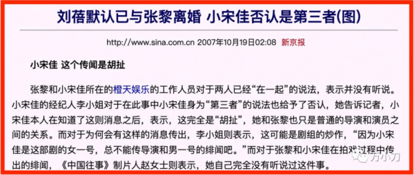 2007年,50岁的张黎在拍摄《中国往事》时, 与27岁的女演员小宋佳传出绯闻。