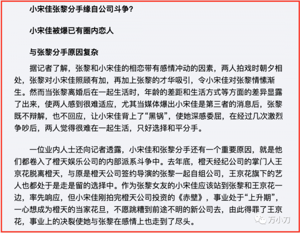 不过也有业内人士爆料说,两人之所以分手,是因为小宋佳卷入橙天娱乐内部的派系之争,牵涉到了已与橙天解约、自己开工作室的张黎……