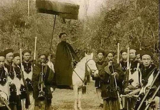 这张老照片是清朝的将军出行,只见这名大将军骑着白马,趾高气扬。