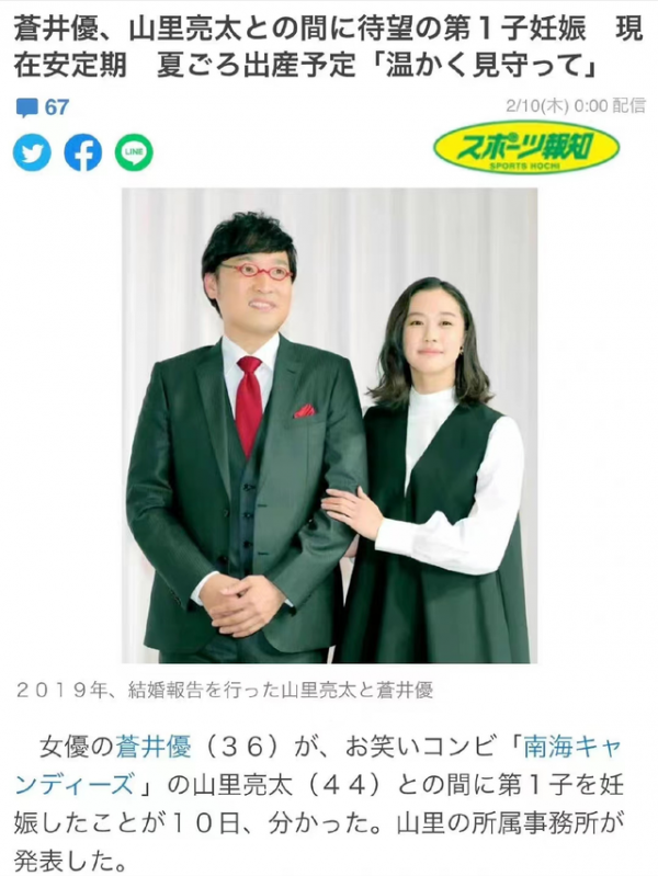 巧合的是,最新出版的《Friday》杂志拍到苍井优夫妇的最新照片,曝光了苍井优的“孕肚照”。