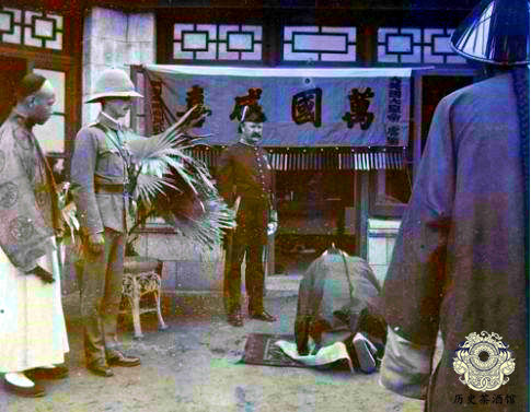 这张照片拍摄于1902年8月9日,爱德华七世加冕为英国国王的时候,山东官员特意赶到驻威海卫英军的军部祝贺,送上"万国咸喜"的锦旗。此时的清朝已经沦为帝国主义统治中国的工具,清政府对洋人唯命是从,就连清朝的统治者都想着"量中华之物力结与国之欢心"。一个腐朽的王朝正摇摇欲坠。