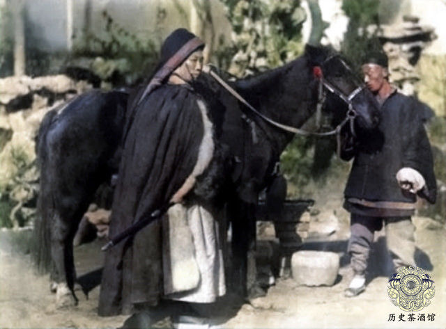 清末一位腰挂宝剑的"侠客"。在众多晚清老照片中这张照片中人物的造型非常特殊,宝剑、披风、骏马,像极了武装剧中的"侠客"。清朝时期虽然也对民间兵器进行管制,但是针对的主要是火器,对于弓箭、腰刀、佩剑等冷兵器管制相对宽松。