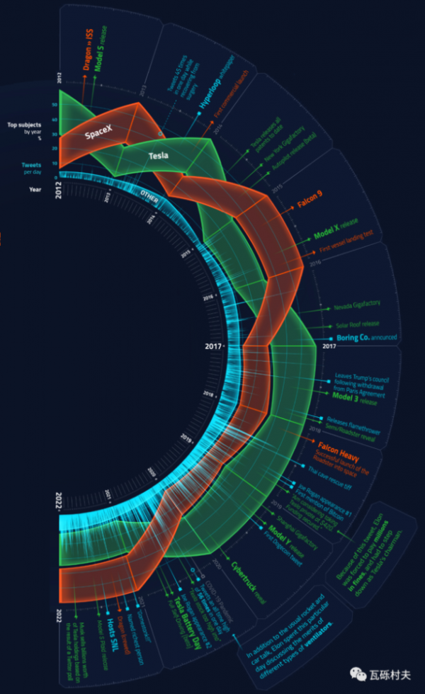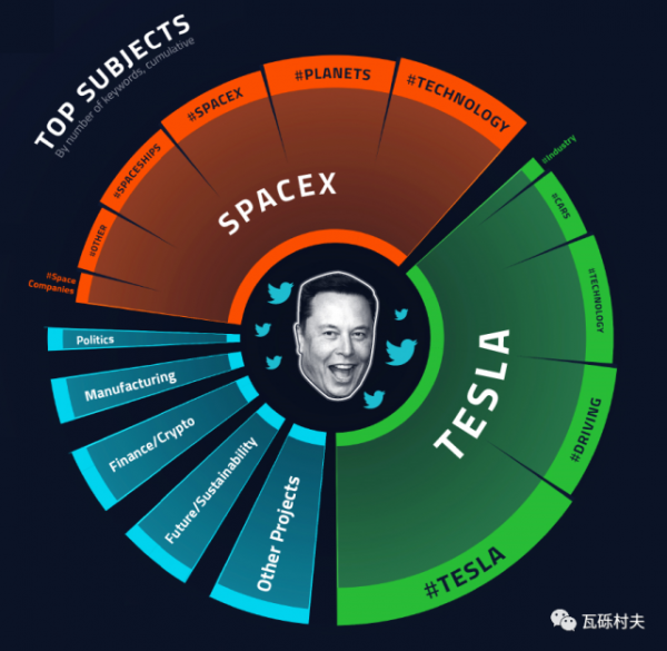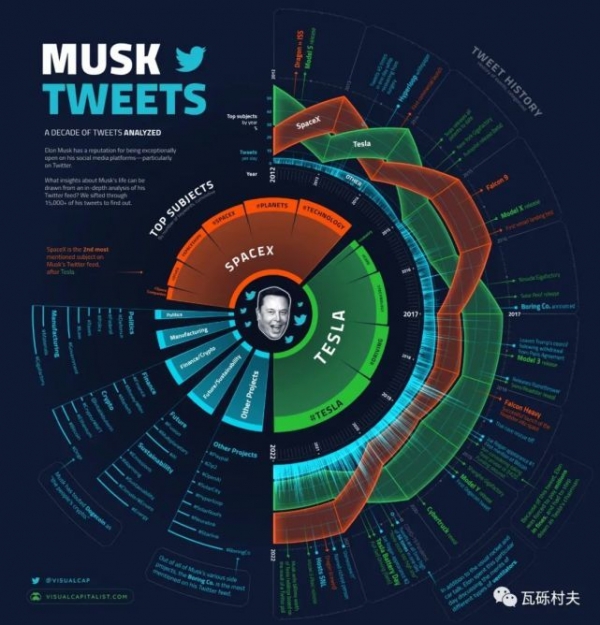 排名结果显示在图片中间的圆形图表中,该图表显示了马斯克在过去十年中发布最多推文的主题。