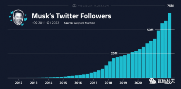 目前,马斯克不懈地使用着推特,2021年除了14 天之外,他每天至少发一条推文。多年来,他的追随人数也在稳步增长: