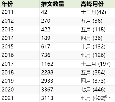 虽然推文内容的主题保持的相当一致,但推文的频率多年来一直在增长。