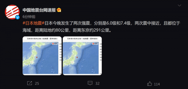 据中国地震台网速报微博消息,中国地震台网正式测定:日本16日晚发生了两次强震,分别是6.0级和7.4级,两次震中接近,且都位于海域,距离陆地约80公里,距离东京约291公里。