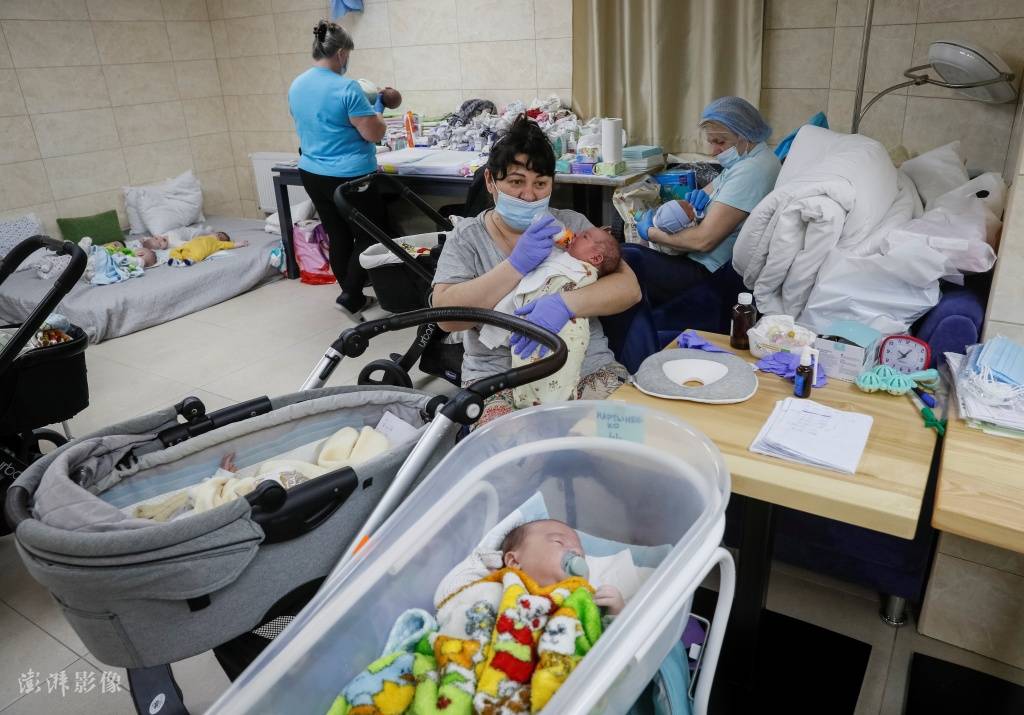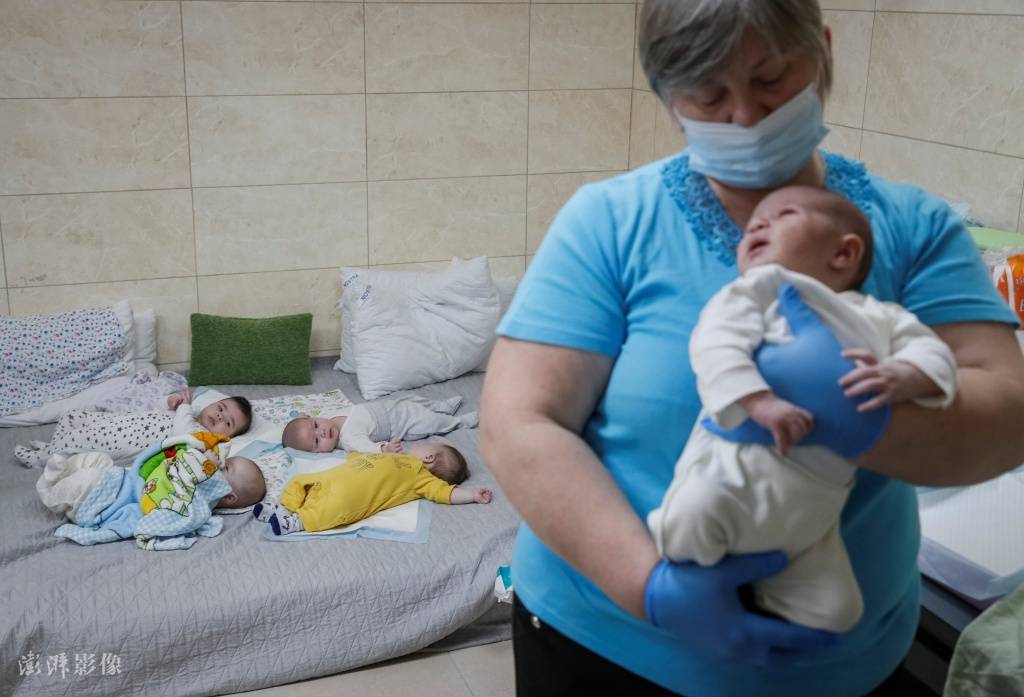 当地时间2022年3月15日,乌克兰基辅郊外,俄乌冲突持续,地下室内的诊所里挤满代孕妈妈生下的大量新生婴儿,由护士帮助照顾,等待外国父母前来认领接走。