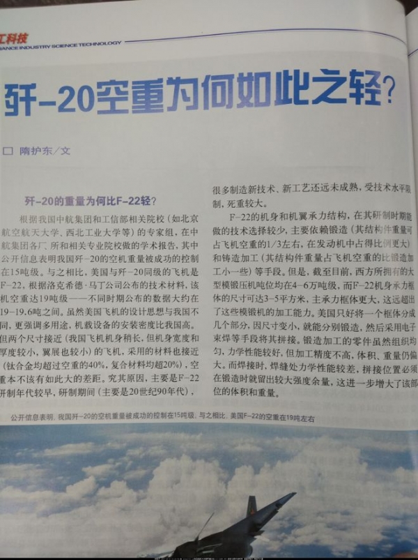 2017年,国内专业杂志《兵工科技》的文章透露歼20的空重被控制在15吨级