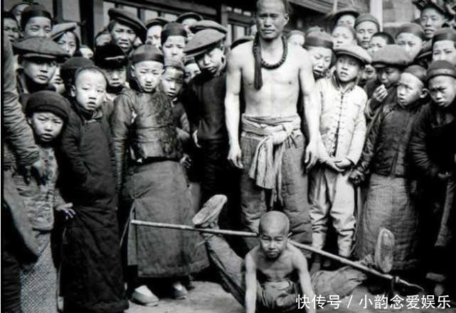 这张照片是清末晚期大街上表演杂技的人们,这些孩子从小便要练功,直到七八岁的时候便可以上街表演赚钱了。