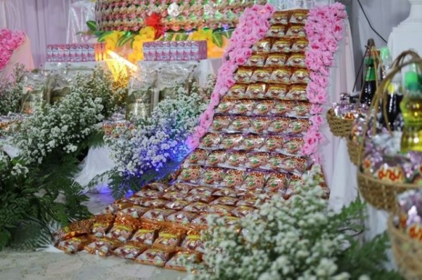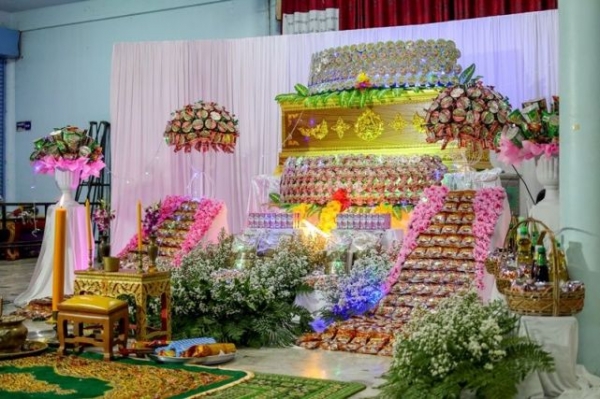 为了装饰灵堂,他的亲人一共买了500多包袋装方便面和400多桶桶装方便面。此外,现场还有牛奶、热巧克力、卫生纸、食用油和鱼露。这些物品像鲜花一样被摆得整齐美观,外面还用包装纸包好,放在普拉哈利的棺材周围。