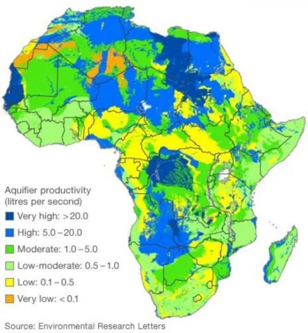 2012年的时候,通过现代的勘探技术,科学家们第一次对非洲大陆整个含水层进行了分析,来自英国地质调查局和伦敦大学学院的研究人员详细绘制了非洲大陆地下水资源的储量情况(如下图)。