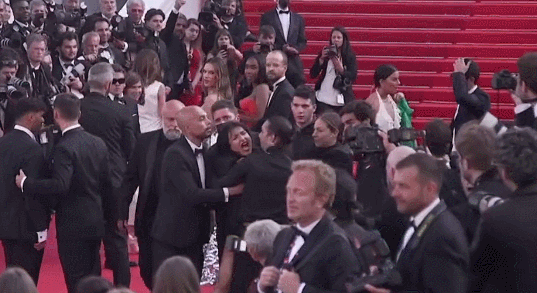 红毯上的这场骚乱,直到周边安保人员上前用西装包住女子并将其拖走才告一段落。