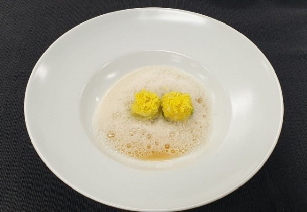 其次第一道主菜是松茸粥和泡萝卜--你没看错,这碗粥加泡菜对中国人来说可能就是一顿早饭,但的确是韩国宴请拜登的第一道主菜。