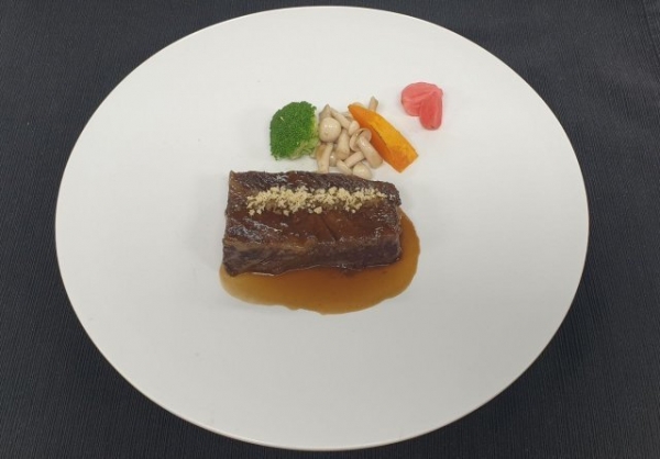 第三道主菜终于迎来一道硬菜,也是这次国宴上的唯一肉菜:低温慢煮牛肋排配嫩煎蔬菜。韩国媒体称牛排其他所有菜式都是韩国传统佳肴,加上韩国本地食材。为了考虑拜登及其随行人员不太熟悉韩国口味和韩美首脑会晤的意义,才选择了美国牛排进行烹饪。