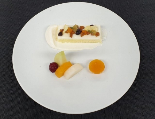 第五道甜点是新鲜水果、坚果配米糕和橘子果冻,感觉搭配挺随意的,有点像外卖附赠的小吃组合……