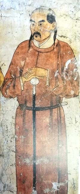 髡发,著圆领窄袖红色长袍,内露白色中单,腰系革带,脚蹬黄色靴子的契丹侍卫(内蒙古赤峰小五家乡塔子山2号墓出土)
