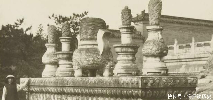图为外国人游览十三陵图。他们凭借特权,在石刻马身上坐着,这些外国人甚至还有人对我国的物质文化进行掠夺。