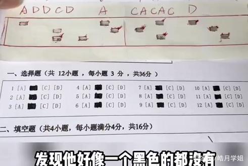 在考试的全部题型中选择题比较简单,就连学渣都能填满,不过他们抱着蒙对几分是几分的态度,正常来说四分之一对的几率,蒙对的可能性还是很高的,但没想到一位"高手"却完美的避开了所有正确答案,到底是怎么回事我们来看看吧!