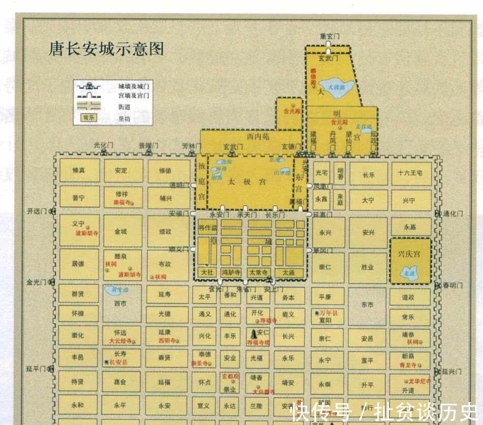根据记载来看,长安城分别有宫城、皇城、外郭城、东西市等。外郭城以朱雀大街为界,形成了一个中轴对称、均衡分布的布局。根据现如今的绘制图来说,长安城是一种方格网式的规划,类似于现如今的棋盘。不得不说这种规划是很罕见的。