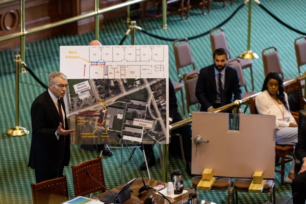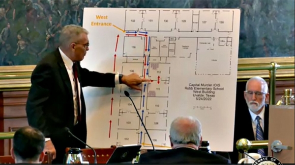 听证会上,麦克劳展示枪手在小学内移动的路线图。图片来源:得州参议院