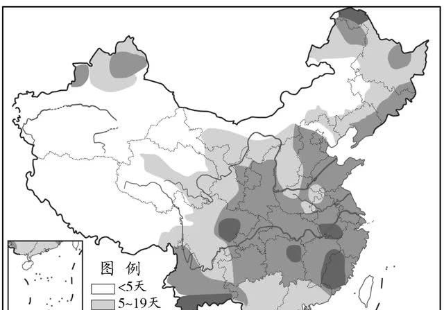 那么,长江流域容易发生大雾吗?我们观察一下全国平均雾日分布图。