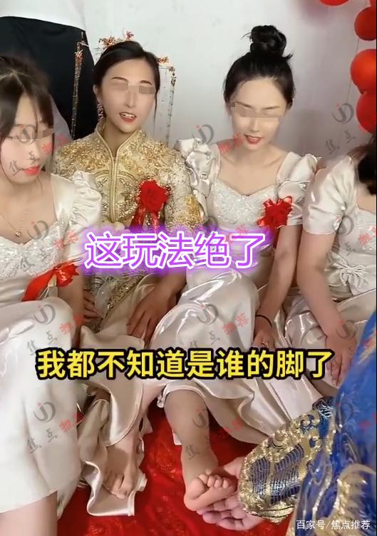 只见新娘和伴娘们坐在床上,伸出脚,让新郎捏脚辨认哪一个新娘的脚,这个游戏看上去就很难,因为大家都不会注意新娘的脚,情侣之间也不会注意,如果不是捏脚专业毕业的,真的不知道怎么分辨,新郎能挑战成功吗?大家都捏了一把汗。