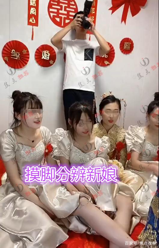 在视频中,为了为难新郎,有人提出让新郎摸脚辨认新娘,来一个"唐伯虎点秋香"的游戏,因为情侣之间摸手辨别已经很常见了,可是摸脚这个套路,貌似有点难度了,摸手是习以为常,不能让新郎轻易过关,所以伴娘们纷纷表示让新郎摸脚,这个如果么有练过,那就会闹出尴尬的事情,一旦认错人,那就出笑话了。