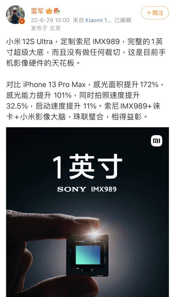 6月29日,小米官方正式宣布小米12S Ultra将首发索尼IMX989传感器,配备完整的1英寸超级大底。据小米公司CEO雷军的个人微博称,对比iPhone 13 Pro Max的感光面积提升193%,感光能力提升76.8%。