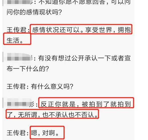 王传君回应感情状态时也一度表示:"感情状况还可以。享受世界,拥抱生活"。他还表示公不公开恋情在自己看来没什么意义,即便被拍到了也是无所谓。