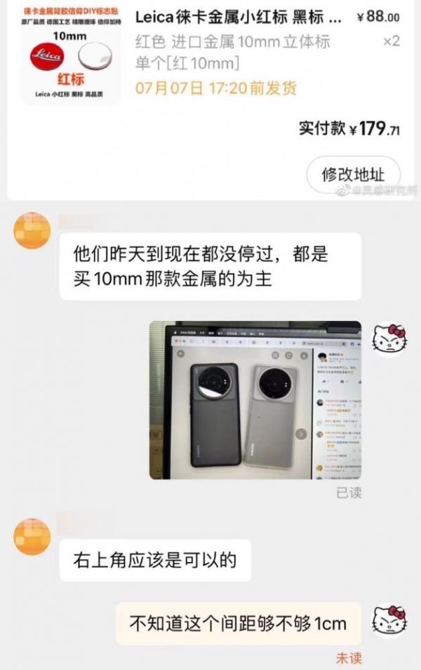 历史越是悠久的品牌,越是会以独特的风格和品牌标识深入人心,例如徕卡的小红标、蔡司的小蓝标等。在昨夜发布的小米12S系列上,首次与徕卡联合研发了影像系统,并在摄像头的位置上以"LEICA"字样作标识,但令网友们比较不满的是,如此深入的合作和盛大的宣传竟然没有徕卡经典小红标或是任何红色的元素。不过,网友们自有办法。据悉,在发布会结束后,"徕卡金属小红标"相关商品在淘宝上突然开始热卖,而且大部分购买的都是10mm尺寸,这个大小刚好适配小米12S Ultra镜头模组的尺寸。