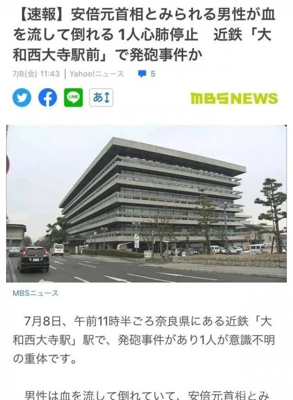 据日本MBS新闻报道,当地时间7月8日上午11时30分左右,位于奈良县的近铁"大和西大寺站"发生枪击事件,正在进行演讲的日本前首相安倍晋三被枪击,处于心肺停止状态。事发时,现场约有30人。目前,警方正在对现场情况进行详细调查。