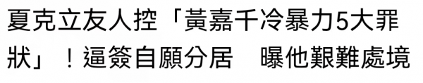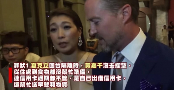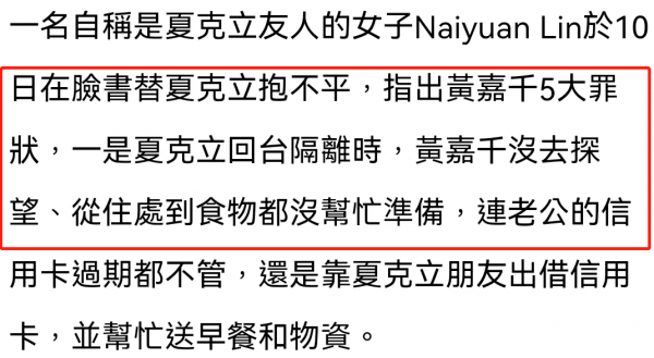 如今双方的好友也开启了互怼和爆料的模式,先是男方的友人在社交网站上为夏克立抱不平,直接出面控诉黄嘉千冷暴力等五大罪状,第一:夏克立在台湾隔离时,黄嘉千不闻不问,没有探望。连老公的信用卡过期都不管,还是靠朋友借信用卡并帮忙送早餐和物资等等