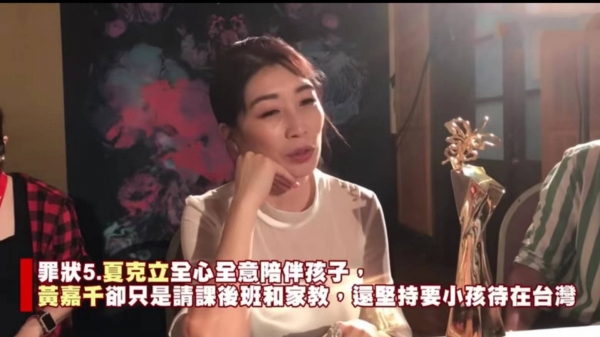 第二夏克立看心理医生和婚姻咨询时,黄嘉千私下询问医生病人信息和用药。第三夏克立上酒店的乌龙事件,称当时黄嘉千没有立刻帮忙澄清,导致其丢了工作,第四隔离期不准夏克立回家,要签"自愿分居"的文件才能拿到生活费。第五夏克立全心全意带孩子,女方则是请家教还要求孩子必须留在台湾。