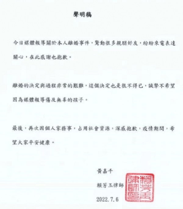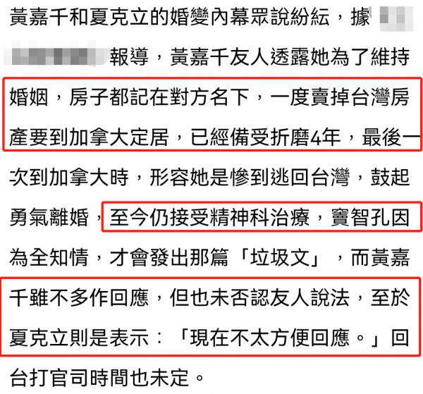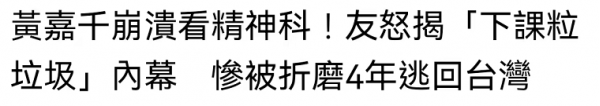 友人表示黄嘉千最后一次到加拿大时是惨到逃回台湾,早前因为情绪崩溃要看精神科,而且黄嘉千至今都要接受精神科治疗,如今鼓起勇气离婚,还闹到对簿公堂的局面,可见两人确实不欢而散,根据港媒报道,对于友人的爆料,黄嘉千并未多做回应,但也没有否认友人的说法。