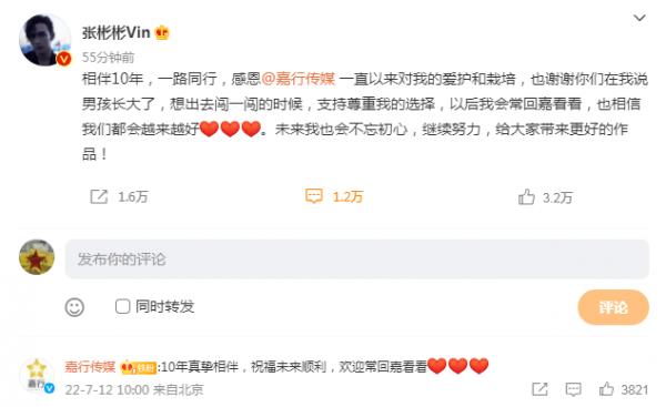 他在文中这样说道:"相伴10年,一路同行,感恩嘉行传媒一直以来对我的爱护和栽培,也谢谢你们在我说男孩长大了,想出去闯一闯的时候,支持尊重我的选择,以后我会常回嘉看看,也相信我们都会越来越好,未来我也会不忘初心,继续努力,给大家带来更好的作品!"表示了自己对嘉行公司的感恩,谢谢他们对自己的栽培。而且嘉行官媒也是在下方评论,对他的离开表示祝福,希望他能越来越好,欢迎常回嘉看看。