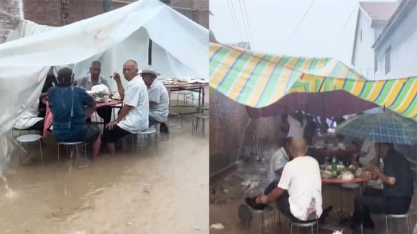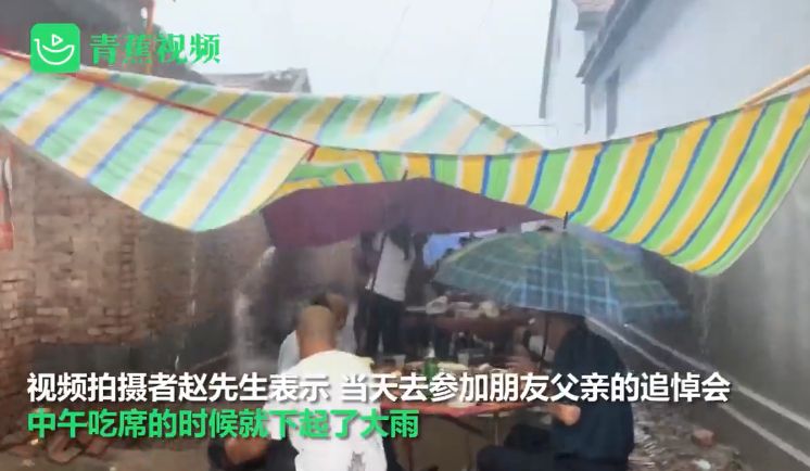 而此时,附近村民还在淡定吃席,桌子上方就用一块塑料布挡着大雨,雨水哗啦啦从四周落下,小伙表示 ,这还是第一次见到这样的场面。