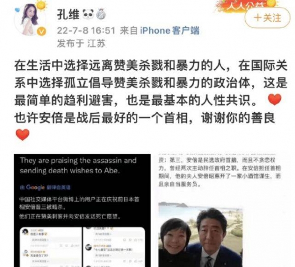 女星孔维更是晒出 自己与安倍的合照,并称赞也许安倍是战后最好的一个首相"。而她的配图中有一张是的外网吐槽中国网友的截图,她所想表达的意思,不言而喻。
