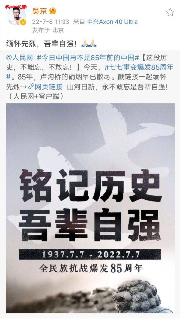 而有位明星的举动却有点意味深长。吴京在七七事变爆发85周年时没有任何的动作。可就在7月8日,吴京突然更新社交动态,转发了七七事变爆发85周年的微博,并配文:"缅怀先烈,吾辈自强!"