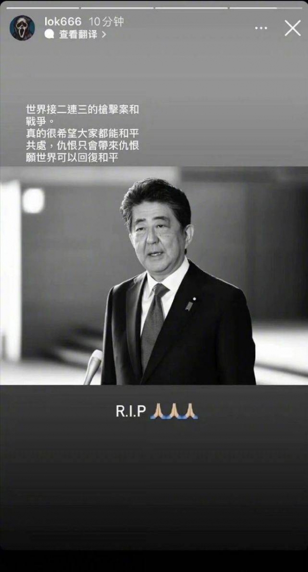 同样发文悼念的还有港星余文乐,他在INS发文悼念安倍晋三,称:"真的很希望大家都能和平共处,仇恨只会带来仇恨,愿世界可以恢复和平。"还配上了安倍晋三的黑白照和三个双手合十的表情包。