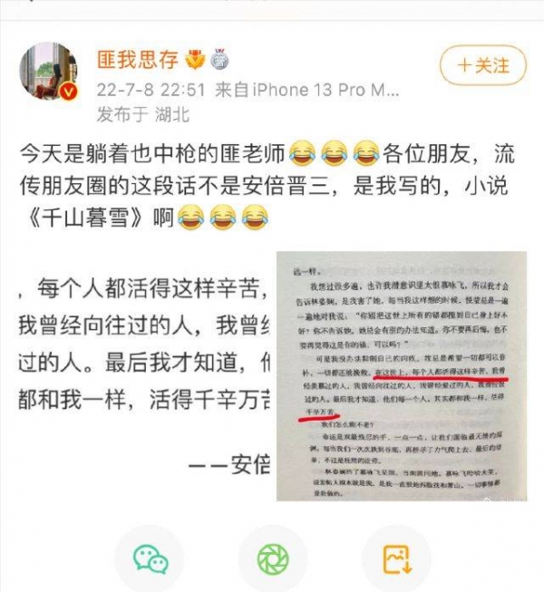 搞笑的是,这段文字压根就不是安倍所说的,二四 著名网文小说家匪我思存在小说《千山暮雪》中所写。