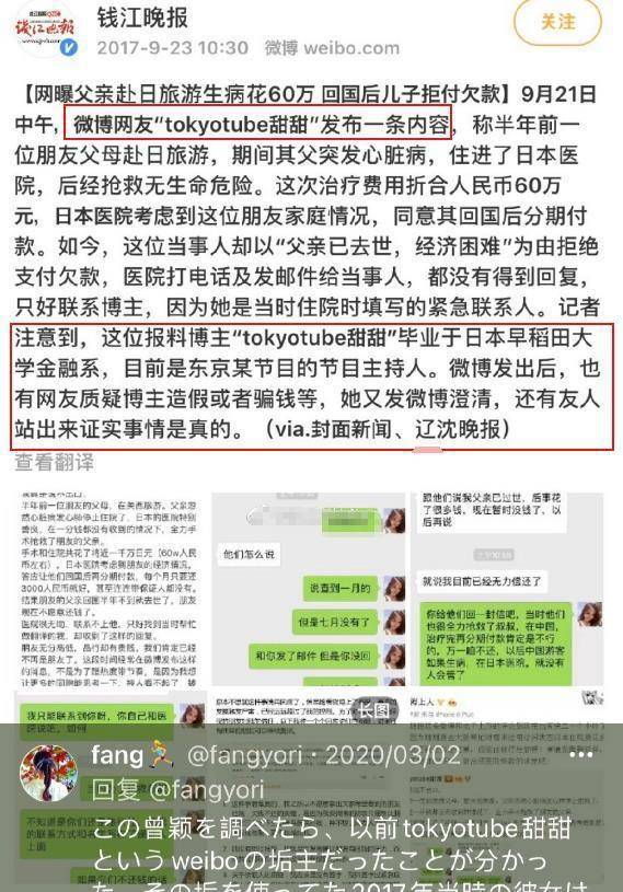 事实上,曾颖一直是个有争议的人。早在两年前,她在日本街头以武汉的报恩的名义发口罩,被日媒报道。马上就有人翻出了她的黑料,包括她曾经用的微博名:tokyotube甜甜,涉及众筹医疗费事件,结果被人扒出造假。