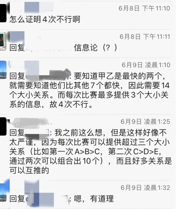 当时,我在朋友圈里发了这个问题,许多同学都很快给出了5次的答案。不过,有两名国际金牌,一直在讨论为什么5次就是最少的,为什么4次就不行?