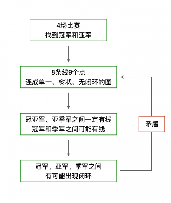 根据刚才所说,图中不能形成闭环,既然冠军和亚军之间、亚军和季军之间一定有连线,那么冠军和季军之间是不可以有连线的。可是你要注意:在我们进行第一场比赛时,随机选择了三辆车,如果选择的三辆车分别是冠军、季军和第四名,那么比赛后,根据我们的构造规则,冠军和季军分列小组第一和第二,它们之间会做出一条连线。这样,所有比赛结束后,冠军、亚军、季军就会出现一个闭环。