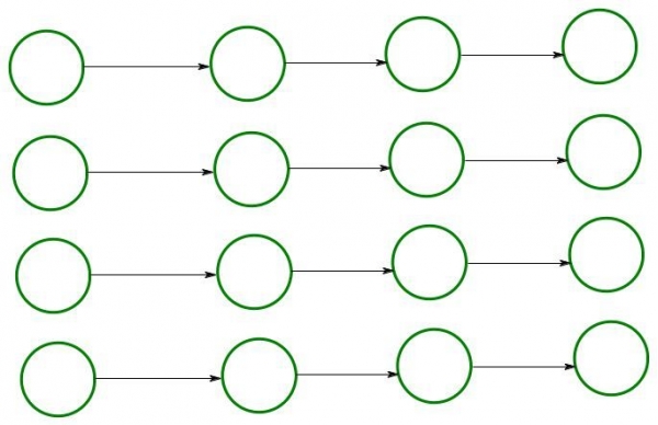 首先进行小组赛:每场比赛n辆车,共有n场比赛。按照刚才的构造方法,我们能把每一小组的赛车排序,并且进行连线。