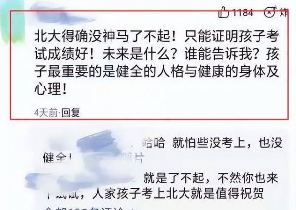 也有网友表示,北大没什么了不起,这只能证明孩子的高考成绩好。而孩子将来的发展、未来都一概不知。该网友表示,孩子最重要的是健全的人格、健康的身体和健康的心理。