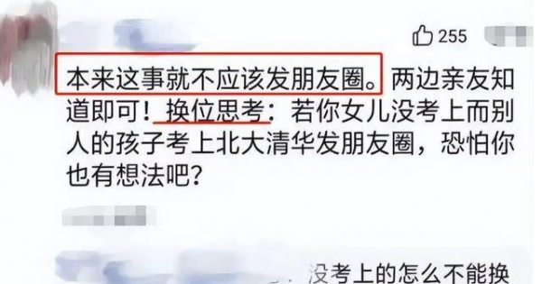 有网友表示王阿姨不应该将女儿考上北京大学的消息发到朋友圈,应该只告诉自家的亲朋好友即可。若是其他家的孩子同样参加高考考上了清华北大,若是自家没考上北京大学、清华大学,那么自己可能会说闲话。