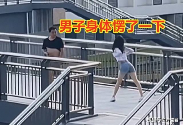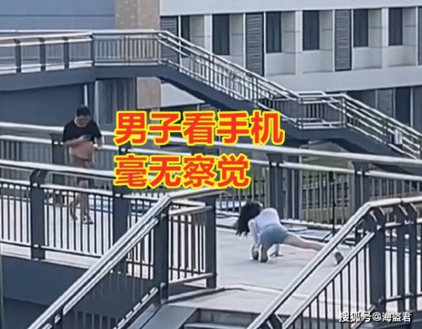 这名男子在天桥上走的时候一直在低头看手机,并没有注意到这名跳舞的女子。