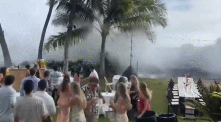 直到巨浪逼近海堤,一些人开始后退。几秒钟后,撞击到海堤的巨浪越出,吞没了用花卉装饰的桌子,并带着桌椅砸向宾客。根据视频,宾客们争先恐后地寻找庇护,一些人惊呼了起来,还有人难以置信地反复念着脏话。