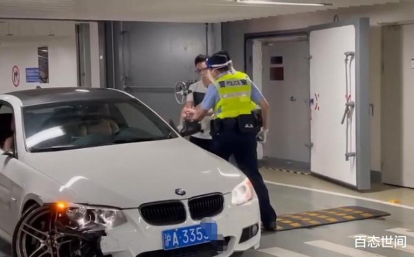 肇事司机曾试图打开车门回到驾驶室,但是被民警阻止了,他还和民警进行了争辩。肇事的是一辆老款的宝马三系轿车,右前轮轮轴已经断了,保险杠右侧已经撞烂了,车库地面上有很长的油渍。
